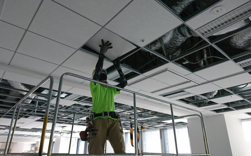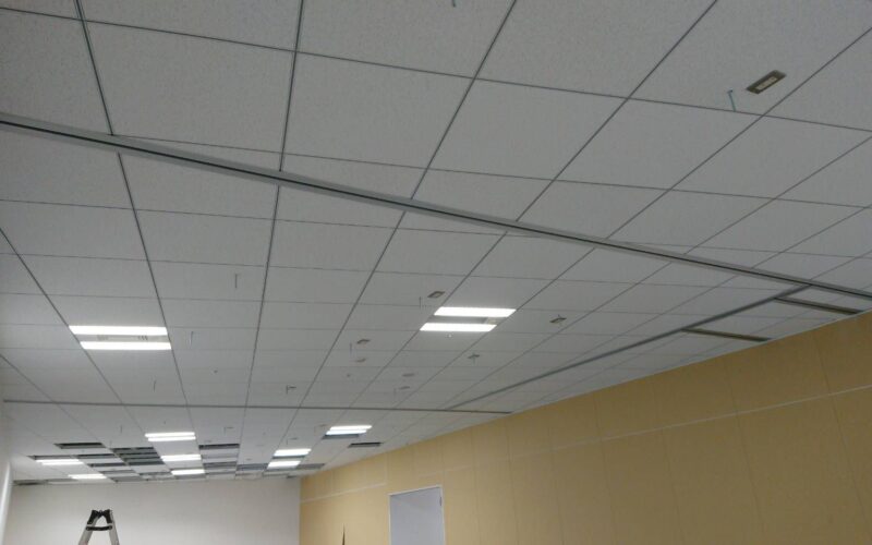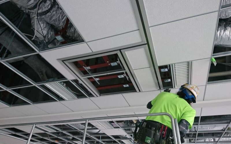 スライディングウォール周り施工と、収納場所を含むシステム天井復旧テナント工事